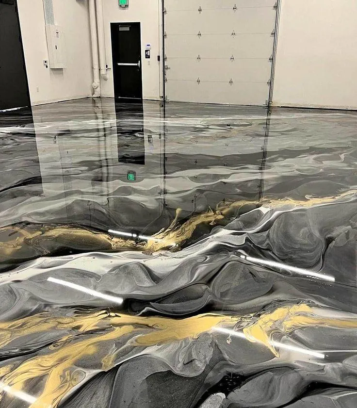 A premium, artistic floor system using metallic pigments suspended in epoxy. Creates a unique 3D effect every time. Durable, stain-resistant, reflective, and easy to clean — perfect for showrooms and luxury spaces.